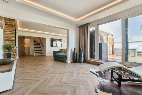 The semi-open kitchen is located at the rear and is equipped with various built-in appliances, including a 5-burner gas hob, fridge with freezer, combi oven, dishwasher, extractor hood, and enough cupboard space. From the kitchen, you have direct access to the backyard.